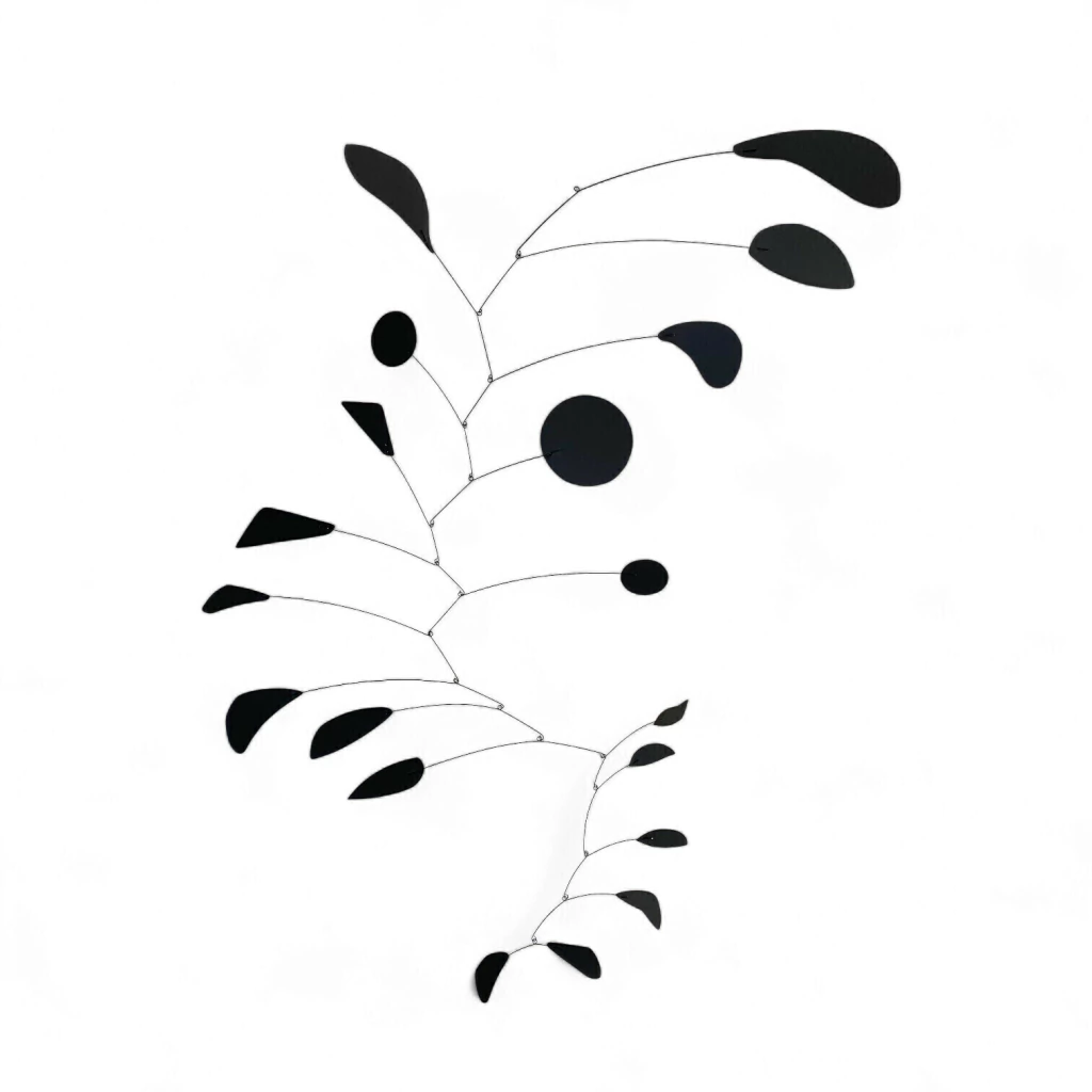 Inspirada na Viuva Negra de Alexander Calder, essa peça homenageia a dançarina Pina Bausch e as formas de expressão corporal através da dança. Repleto de formas variadas, o Móbile Bausch captura olhares e inspira pensamentos. Móbile criado e fabricado no Brasil por Helga Queiroz. Dimensões: 90x85cm.