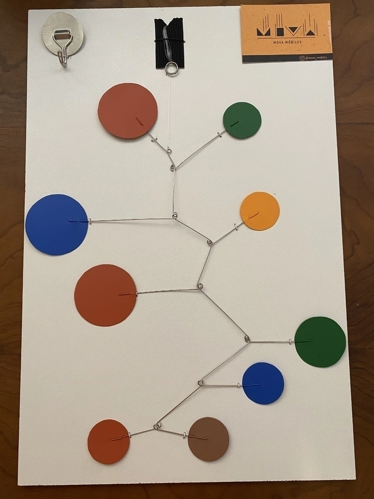 Móbile minuciosamente fabricado à mão em chapa de latão pintado e hastes em aço inox. Possui fio de nylon e vem com um gancho auto adesivo. Dimensões: 30x40cm.